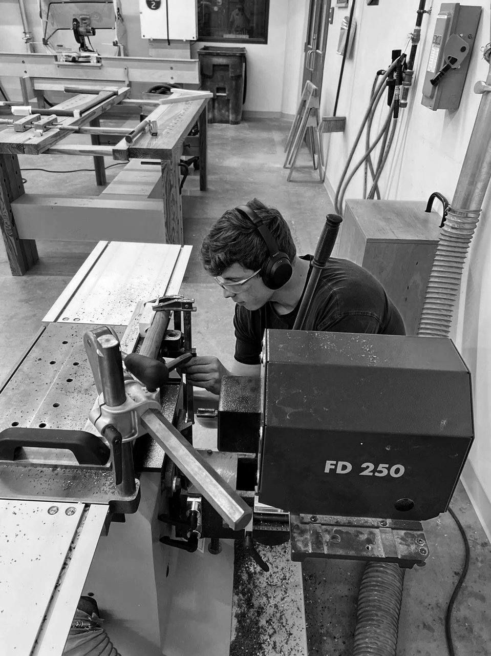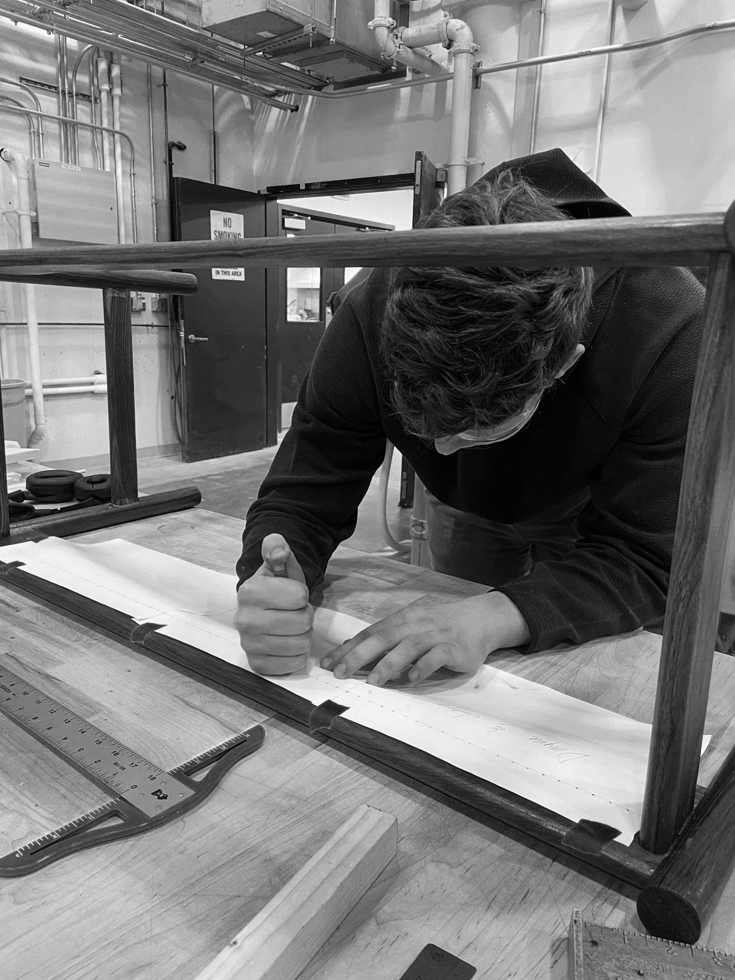 Prior to weaving, I created tenon-and-mortise joints in the dowels I planned on using for the legs of my bench. Using a Triangle held mount to align the dowels with the machine.