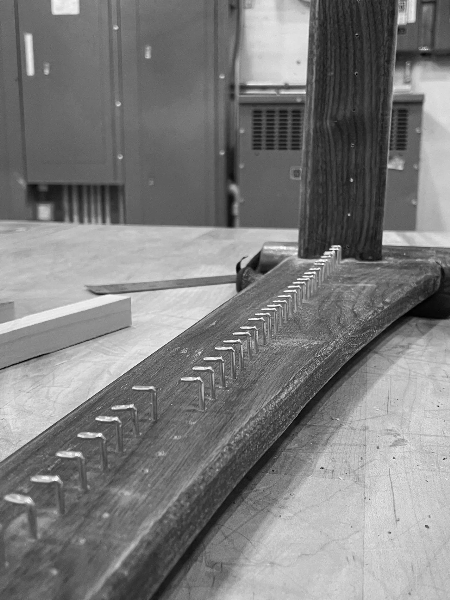 Unlike a traditional woven bench, Mine added a curve. Spacing the nails apart slightly offset allowed me to wrap the weave on the curvature.